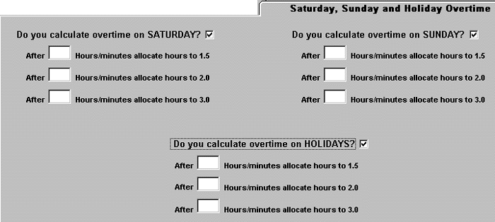This tab is where you can specify what you want ETP to do with Saturdays, Sundays, and Holiday Overtime calculations. The setup is much the same as for Daily Overtime. As with all of the other Time Calculation Rule tabs, the default setting for the check boxes is unchecked.