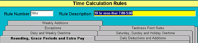 Time Calculation Rules establish the rules for an employee's paid work time. Grace periods for late or early arrival, rounding periods, working past a shift, and over-time rules, are all established here. When you enter work shifts, you will attach these rules to the shift. We recommend that you consult with your Advanced Tracker trainer to decide on, or to change time calculation rules. It is important to understand how changes may impact on future time calculations.
